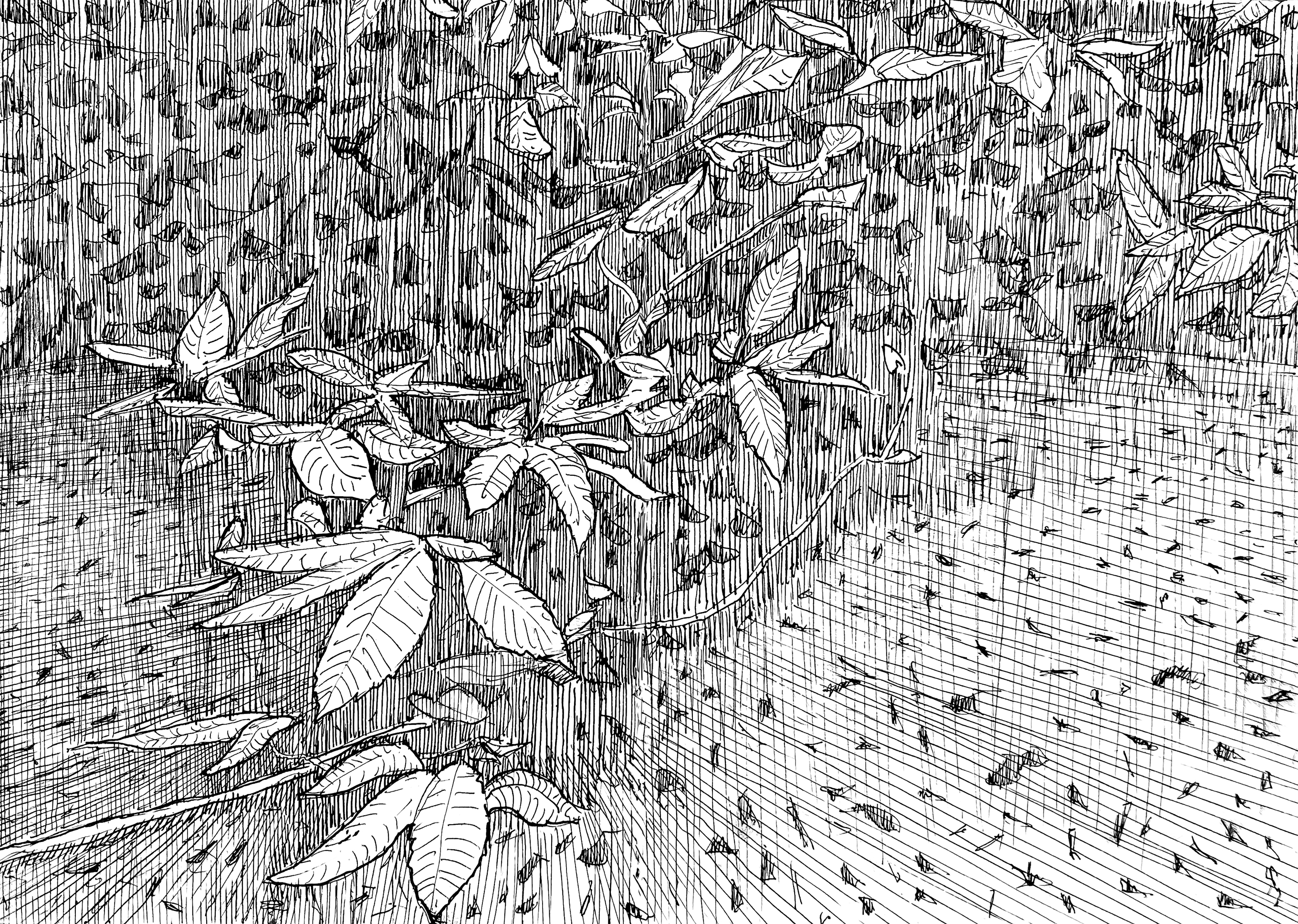 Cette série de dessins, réalisée en immersion totale dans la forêt, traduit l’intensité de la nature par la pureté du trait en noir et blanc. Chaque ligne, marquée et vibrante, exprime la densité et l’abondance de la végétation environnante.