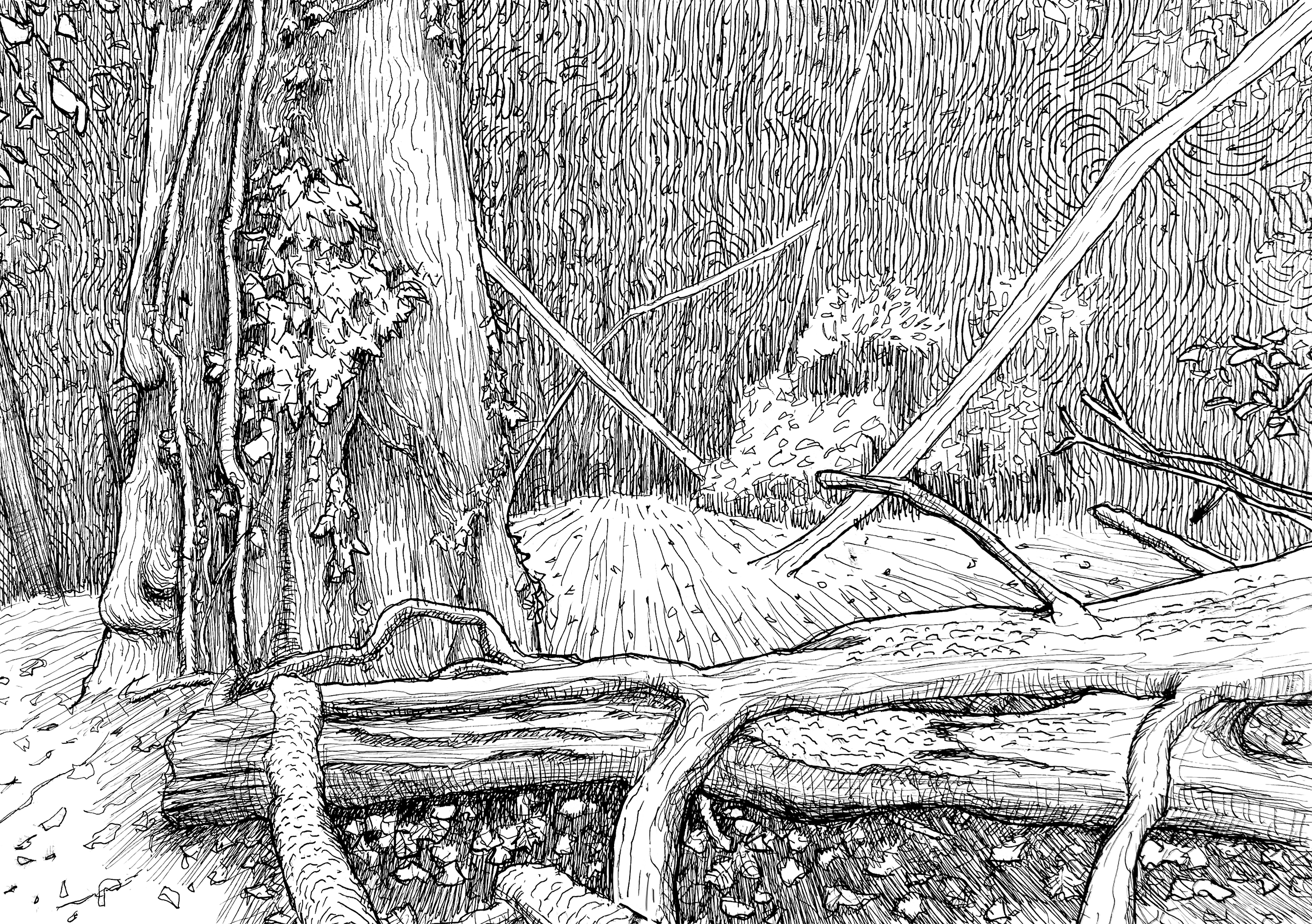 Cette série de dessins, réalisée en immersion totale dans la forêt, traduit l’intensité de la nature par la pureté du trait en noir et blanc. Chaque ligne, marquée et vibrante, exprime la densité et l’abondance de la végétation environnante.