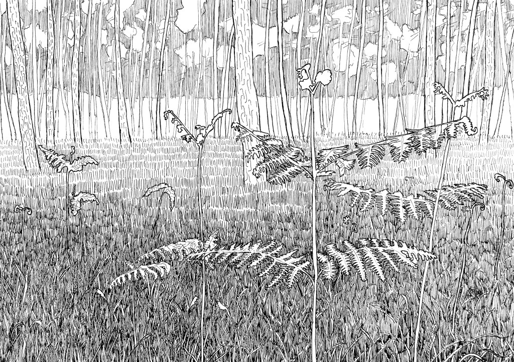 Cette série de dessins, réalisée en immersion totale dans la forêt, traduit l’intensité de la nature par la pureté du trait en noir et blanc. Chaque ligne, marquée et vibrante, exprime la densité et l’abondance de la végétation environnante.